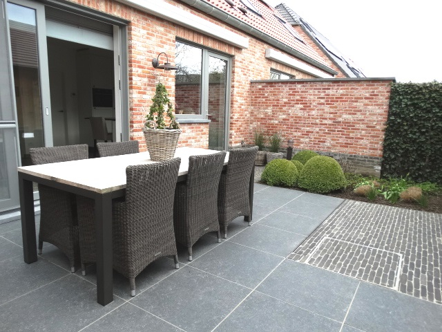 mooi aangelegd terras met aanplanting van buxussen ,volledig omgeven met haag en cottage tuinhuis met zithoek.